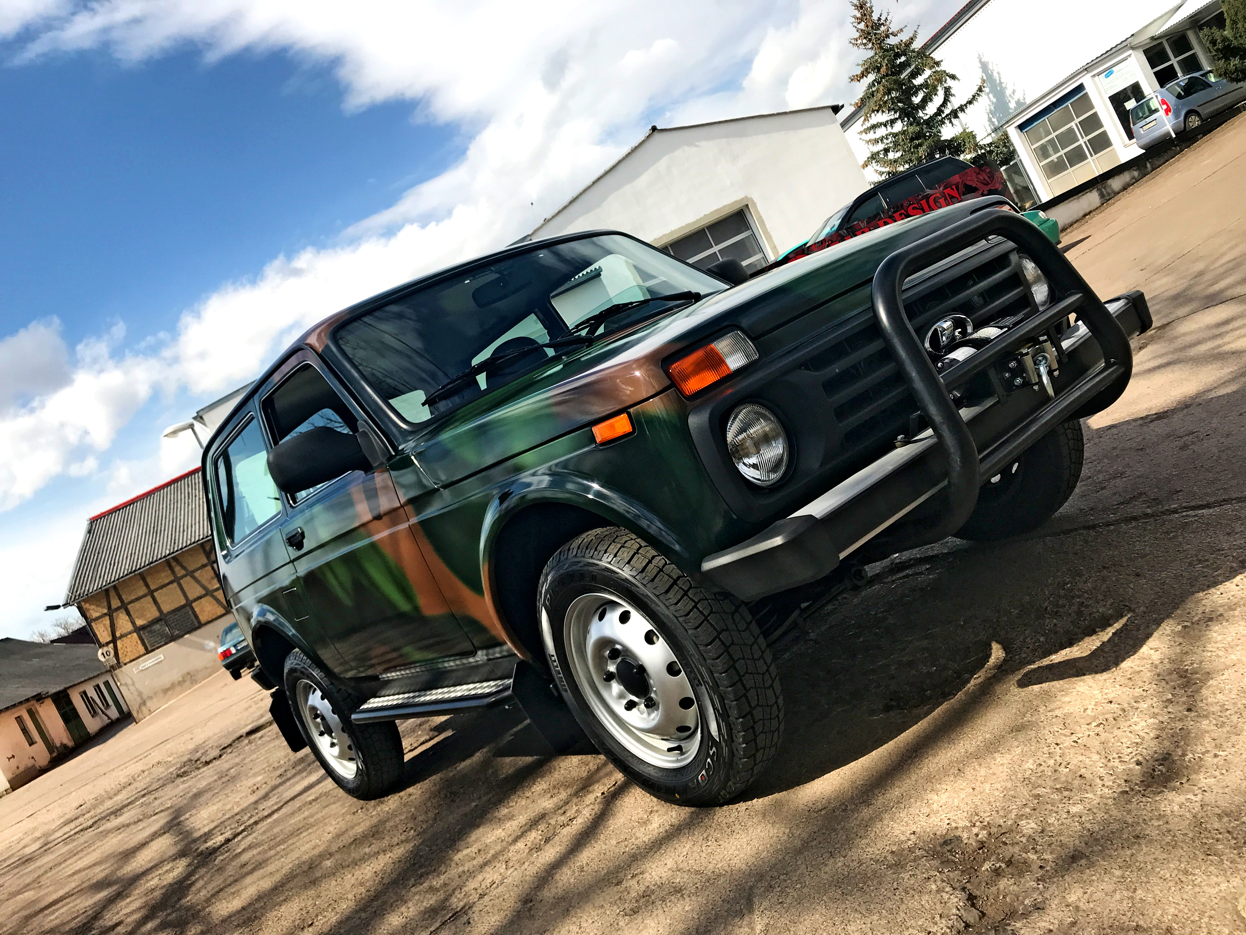 Lada Niva, komplett foliert mit langlebiger Digitaldruckfolie im Camouflagemuster.